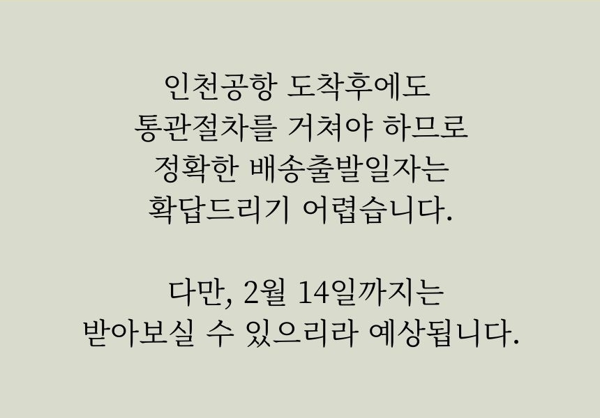 · 평일 오후 2시 주문건까지 당일 발송 (금요일 오후 4시 이후 주문건은 월요일 발송)